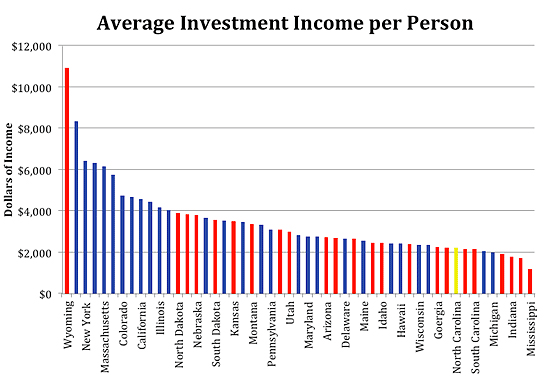 Notice Wyoming is ranked number one in the country for average investment income. This is due to the large number of retired people in the exclusive Jackson Hole Ski Resort area. The next highest-ranking states are Connecticut, New York, District of Columbia, Massachusetts, and Nevada with their average person’s investment income being well over $5,500 per year. Many of the Democrats in Washington are spouting the idea of taxing investment income at higher rates. Unfortunately the majority of investment income is found in democratic states, thus only encouraging the idea that it is OK to tax investment income at a higher rate. North Carolina’s average investment income was $2,207 per person — ranked 43rd out of 51 (DC is included).