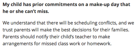 Thank you, Wake County! Thank you for acknowledging that parents can be trusted to make the best decisions for their families. That may mean rescheduling spring break activities. It may mean missing school and making up the work. Parents are best placed to make decisions for their families and to take responsibility for their children’s education. That means choosing which commitments take priority and figuring out how to make up anything that their kids may miss. Parents are up to that.